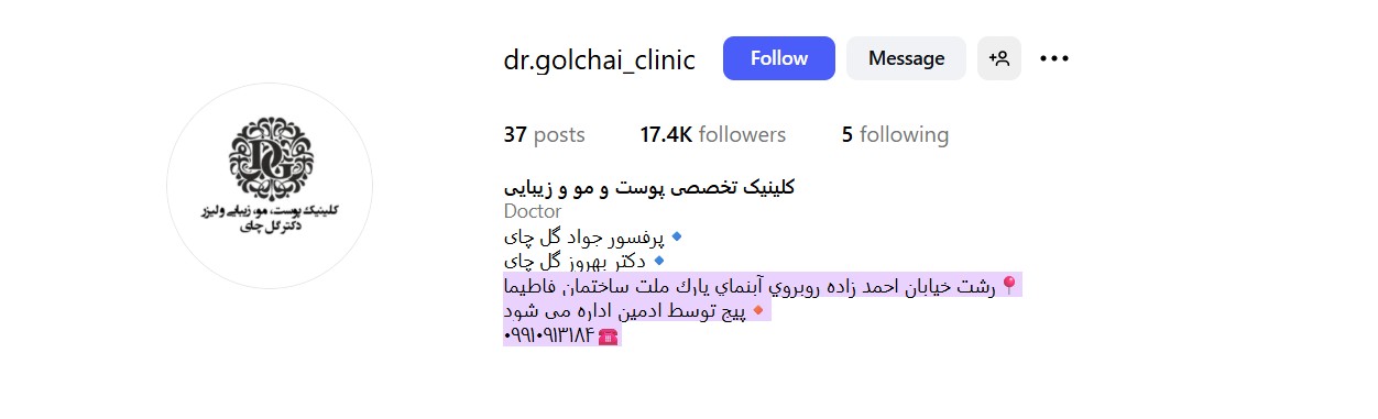 | مطب دکتر جواد گلچای | رشت، خیابان احمدزاده، روبروی پارک ملت | ۰۱۳۳۳۱۱۳۰۵۶ | dr.golchai_clinic |