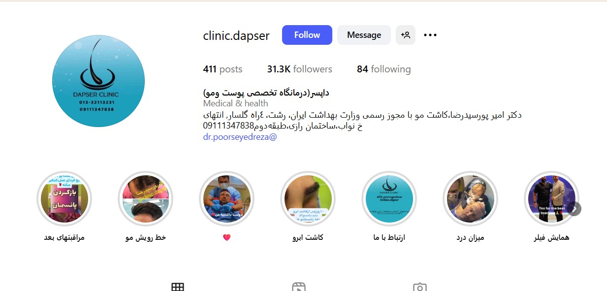 | کلینیک کاشت مو و زیبایی داپسر | رشت، چهارراه گلسار، ساختمان رازی | ۰۱۳۳۲۱۱۳۲۳۱ | clinic.dapser |