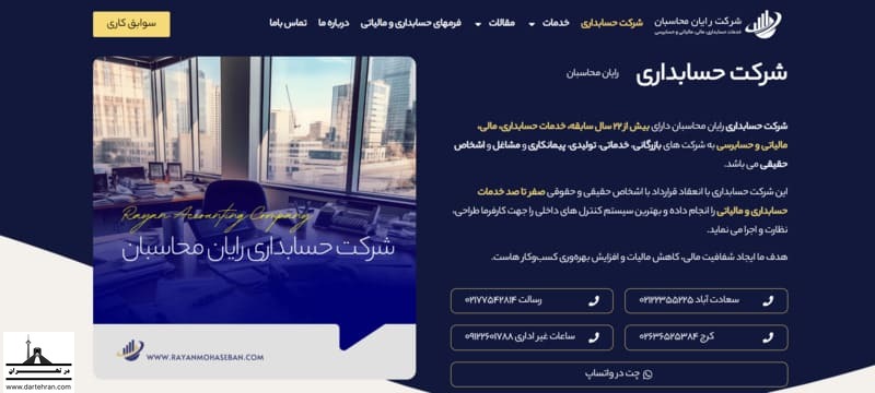 | شرکت حسابداری رایان محاسبان | تهران، سعادت آباد، خیابان سرو غربی، خیابان صدف، نبش کوچه نظری، پلاک 30 | 02128426733 |