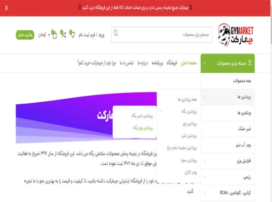 در صفحه اصلی، دستهبندی محصولات را مشاهده خواهید کرد. برای دسترسی به مکملهای پروتئینی، میتوانید از منوی اصلی استفاده کنید یا در بخش جستجو، نام محصول مورد نظر خود را وارد کنید.
