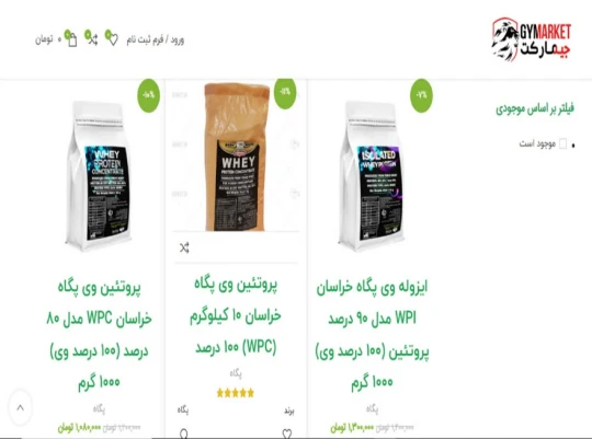 بررسی محصولات: پس از ورود به بخش مکملهای پروتئینی، لیستی از محصولات مختلف به همراه تصاویر، قیمت و توضیحات کوتاه نمایش داده میشود.