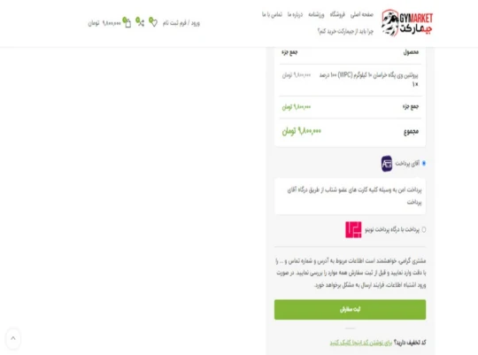 بررسی نهایی و تایید سفارش: پس از وارد کردن اطلاعات، یک بار دیگر تمامی جزئیات سفارش خود را بررسی کنید. در صورت صحت اطلاعات، بر روی دکمه "ثبت سفارش" یا "پرداخت" کلیک کنید.